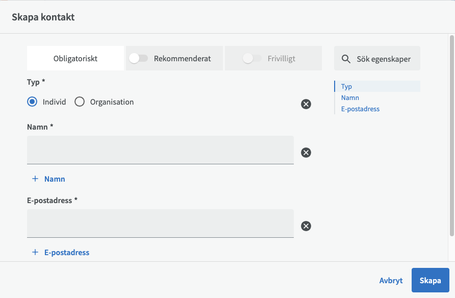 Välj först om kontakten är en individ eller en organisation. Därefter fyller du i namn och e-postadress. Om du vill kan du slå på de rekommenderade fälten och fylla i telefon och postadress också.