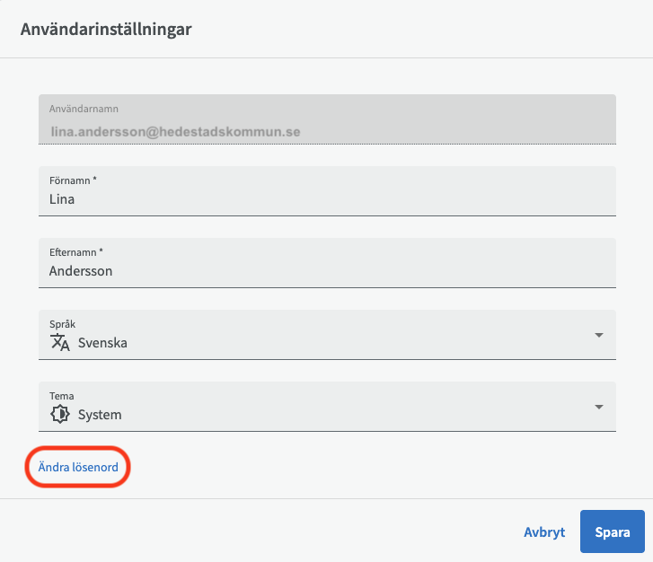 Om du klickar på "Ändra lösenord" så får du ange ditt nuvarande lösenord först för att säkerställa att du är du, samt ange ett nytt lösenord. Lösenordet måste vara minst 10 tecken långt och innehålla minst en siffra samt både gemener och versaler.