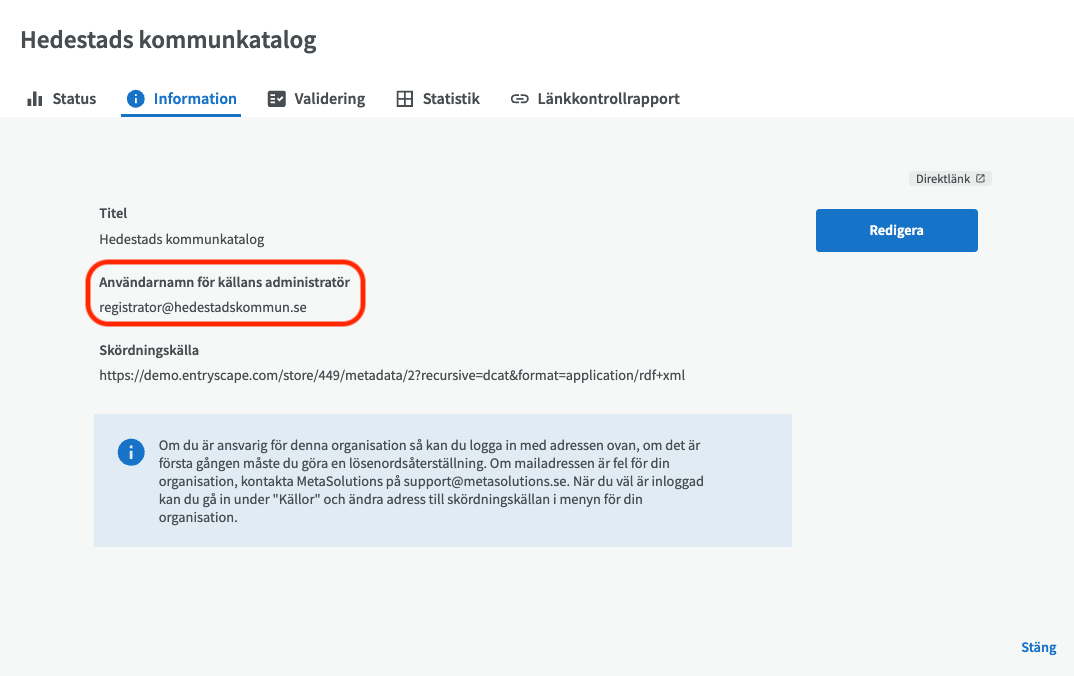 Om du vill ändra skördningskälla eller andra detaljer om din organisation, logga in på EntryScape Registry. Gå in på Källor och klicka på din organisation. Klicka sedan på Information och där kan du klicka på knappen Redigera för att redigera skördningskällans URL.