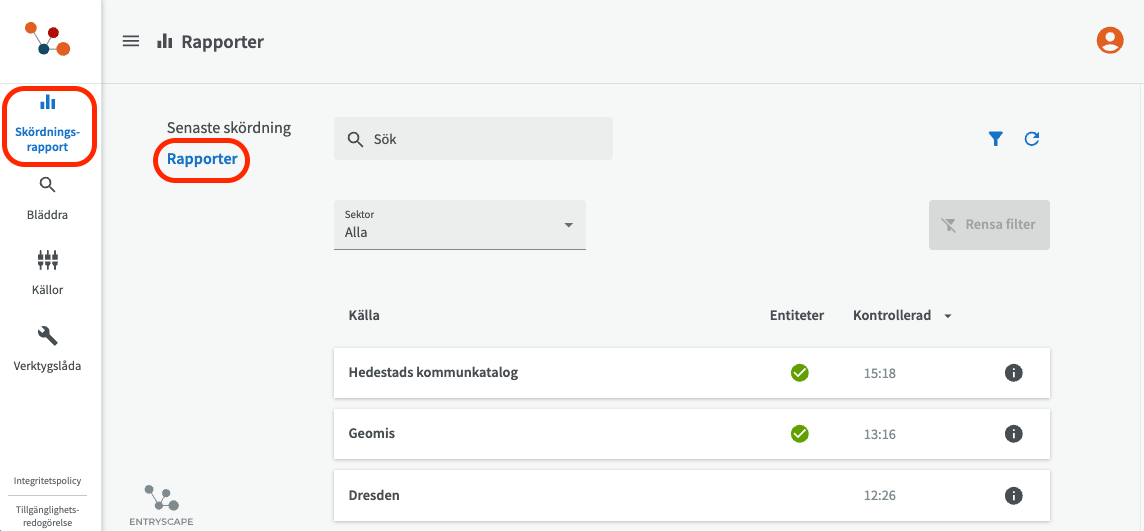 Börja med att kontrollera om din organisation och skördningskälla redan är förregistrad, så att du inte råkar lägga in en extra kopia av din skördningskälla i Registry. Det kan du se om du klickar på Skörningsrapport, sedan Rapporter. Där kan du antingen söka med sökrutan eller bläddra i listan under med källor.