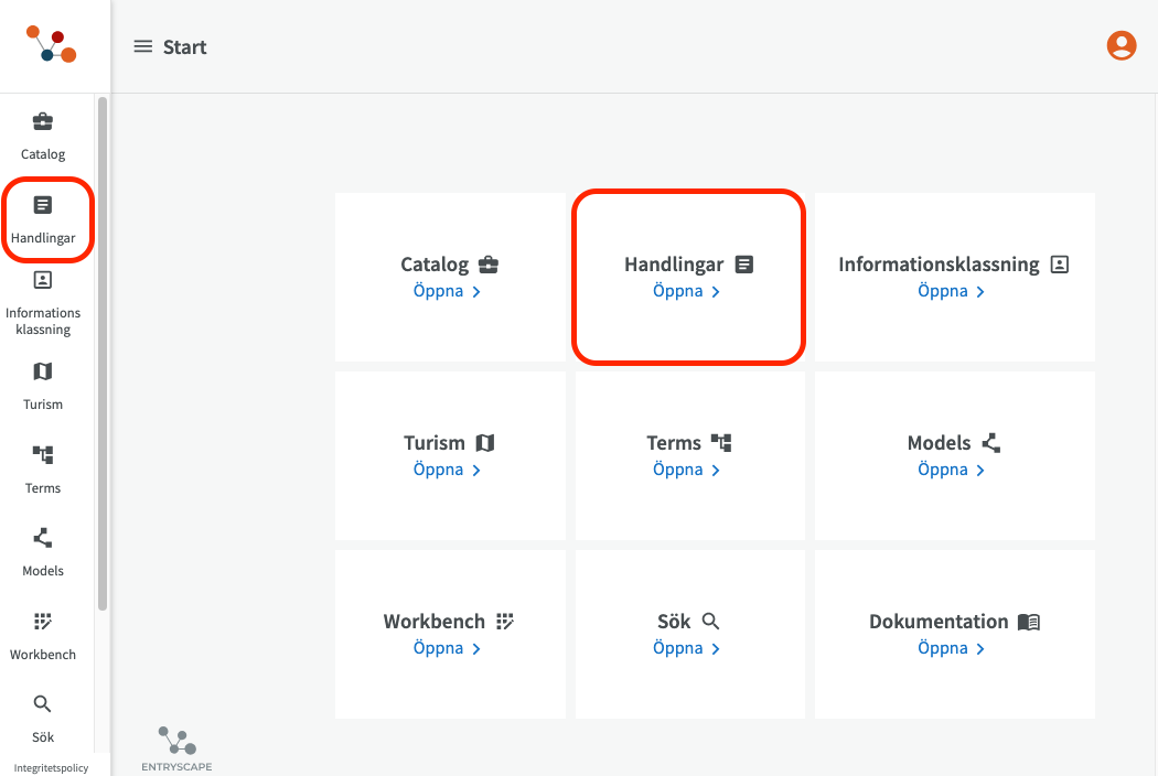 Det går att lägga in genvägar till projekt, specialanpassade projektmoduler på toppnivå, istället för att gå via Workbench. Exempel på toppmoduler kan vara ”Handlingar” och ”Turism”, med skräddarsydda applikationsprofiler och metadatafält. EntryScape kan konfigureras med denna funktionalitet åt användare vid behov.